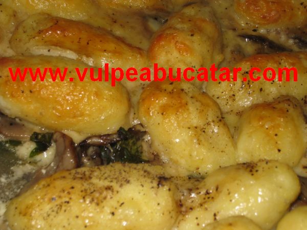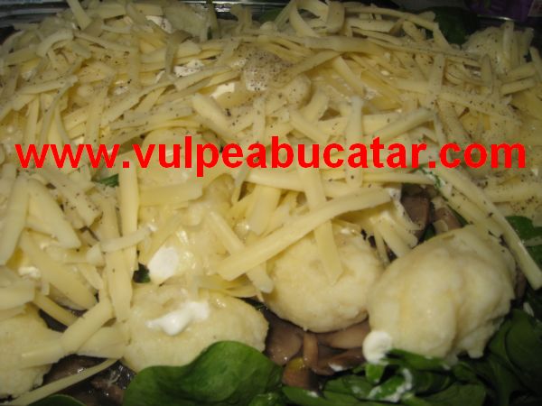 Intr-o tava de 22 × 33 cm (3 l) se pun ciupercile, spanacul si deasupra gnocchii. Se intinde smantana si se rade cascavalul deasupra. Se da la cuptor 20-30 de minute pana se rumeneste frumos.