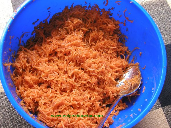 Se pun morcovii rasi cu zaharul maro intr-un castron, jumatate de ora, sa lase zeama.2