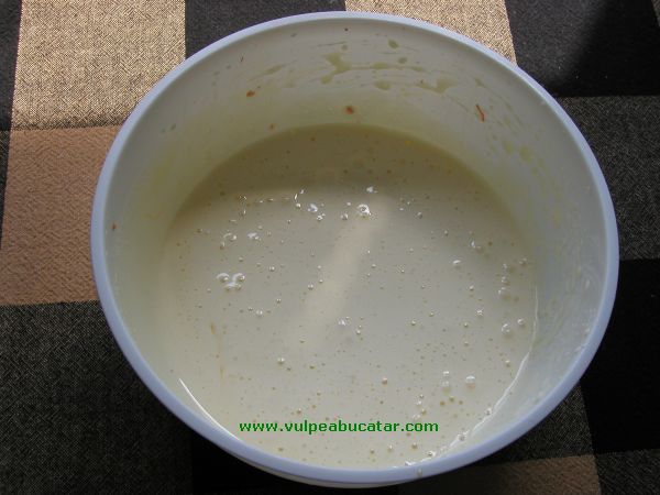 Se bat cu mixerul ouale cu zaharul pana se albesc si arata ca o pasta. Se adauga uleiul si esenta de vanilie, se amesteca sa se incorporeze. Se masoara faina si se amesteca cu scortisoara si bicarbonatul (nu este nevoie sa-l stingeti, este destul acid in compozitie).4