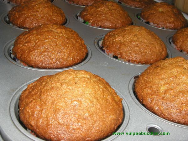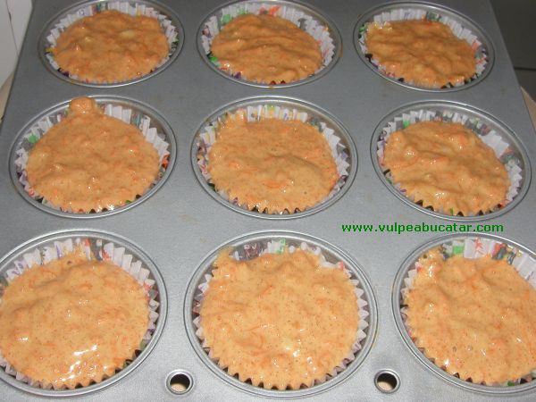 Se pune faina peste oua si se amesteca sa se incorporeze. Se adauga si morcovii si se amesteca. Daca vi se pare prea subtire compozitia mai puneti putina faina. Se dau la cuptor pentru aproximativ 25-30 de minute. Verificati cu o scobitoare daca sunt gata.Sugestii